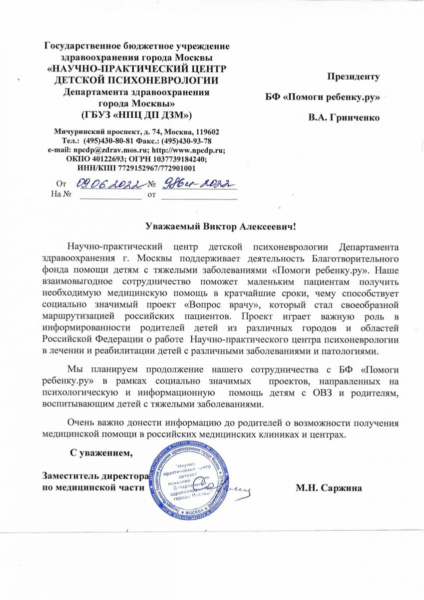 ФГБУ «Федеральный центр высоких медицинских технологий» выразил поддержку благотворительной деятельности нашего фонда и реализуемому в 2022 г. проекту «Вопрос врачу», отмечая его высокую социальную значимость. Научно-практическим центром детской психоневрологии отмечено, что сотрудничество наших организаций играет значимую роль в оказании помощи маленьким пациентам и получении ими необходимой терапии и реабилитационной помощи, информированности семей пациентов о возможных способах лечения и реабилитации детей с различными двигательными и неврологическими патологиями.