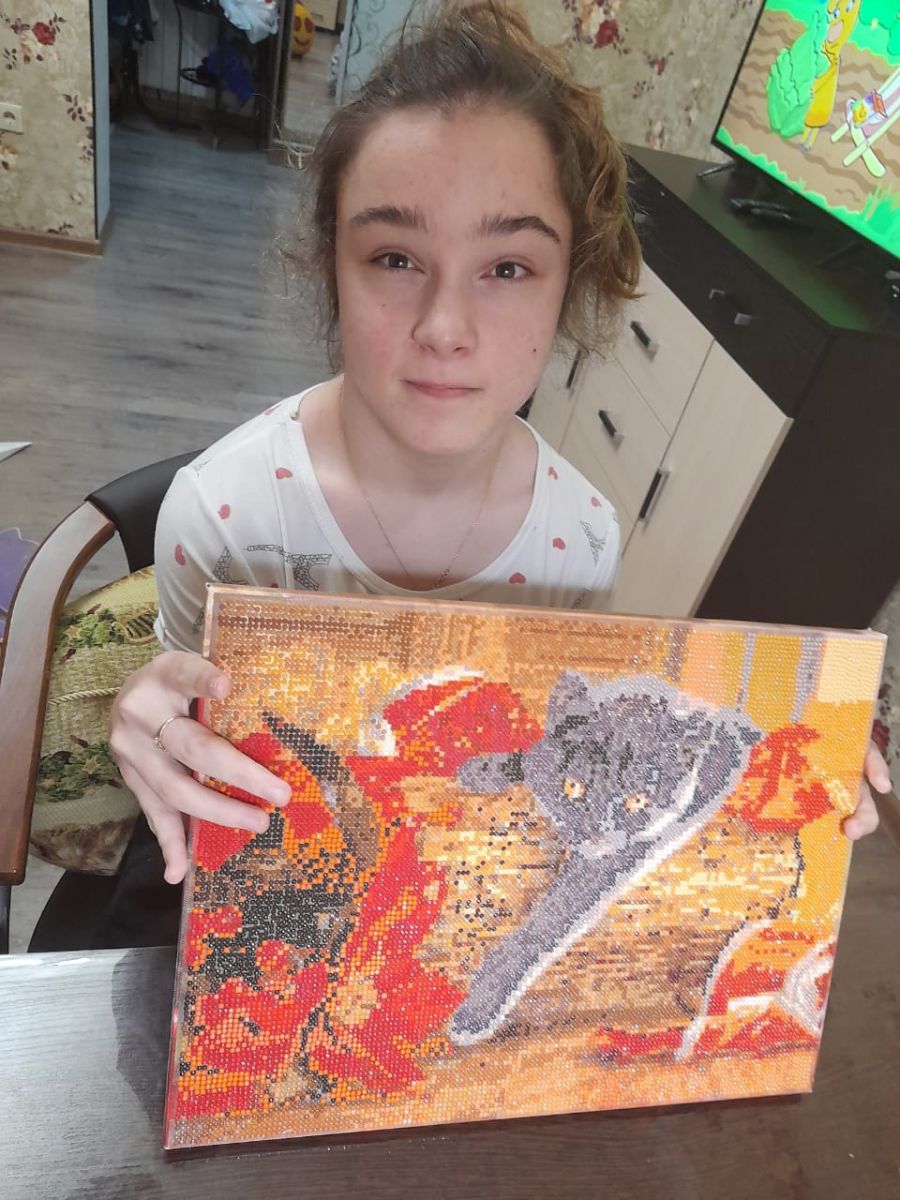 Доброго времени суток, друзья. Немного новостей про Ритулю. Маргарита учиться в 8-м классе в сопровождении тьютора. Учебе даётся нелегко, но она очень старается. Все свободное время проводит за чтением книг или собирает алмазную мозаику. В прошлом году после лечения в ЕКДС руки стали более послушными и Маргоша научилась собирать алмазы в мозаику, научилась писать. Для нас это маленькая победа!