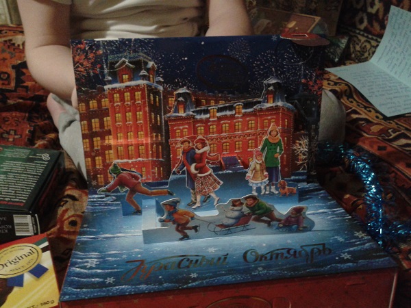 Поскольку Анюта легла спать рано, еще до боя курантов, то подарок нашла только утром и обрадовалась увидеть милкивей. Ребенку так мало нужно для счастья))) Милкивей)))) Хотя в коробке еще были другие конфетки и игрушка. Игрушка понравилась на ощупь))