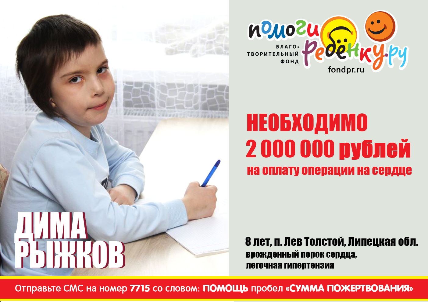 Чтобы успеть спасти сердце 8-летнего Димы Рыжкова, нужно собрать еще 1 886 554 рубля. Вы можете помочь, перечислив средства: