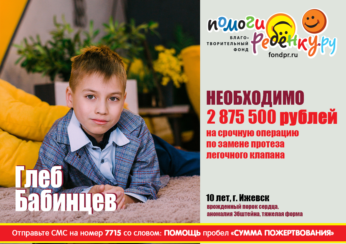Нашему сыну Бабинцеву Глебу сейчас 10 лет. У него врожденный порок сердца – аномалия Эбштейна, тяжелая форма. Глебу было проведено две операции в возрасте 1,5 года (2012 год) и в возрасте 3 года (2014 год). Операции проводили в Deutsche Herzzentrum Berlin.