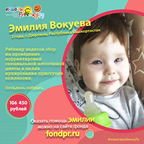 У 2-летней Эмилии Вокуевой тяжелая форма эпилепсии. Раньше на малышку обрушивались по 4-5 приступов в день. И ее развитие остановилось. Все изменилось благодаря подобранной врачами кетогенной диете. Эмилия стала расти и развиваться. И сейчас может заниматься реабилитацией, чтобы восстановить утраченные навыки. В последние месяцы Эмилия научилась сидеть с опорой. И сейчас главное - чтобы приступы не вернулись! Для этого в мае малышка должна поехать в клинику для корректировки диеты. Чтобы эта поездка состоялась, надо собрать еще 108 795 руб.
