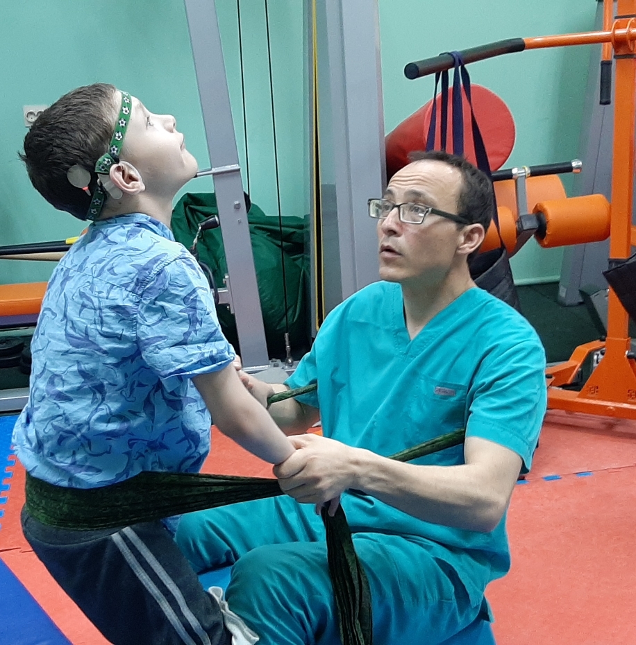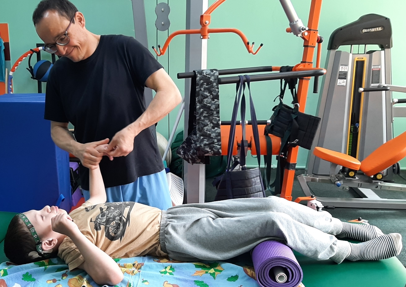 Динар постоянно проходит курсы реабилитации – и двигательные и слуховые, а также занятия с сурдопедагогом, дефектологом. К настоящему моменту он научился ползать на четвереньках, сам встает на четвереньки, сидит с небольшой опорой. Сейчас занимаемся упражнениями для укрепления спины, чтобы сын мог лучше себя удерживать, потому что спина у него очень слабая, делаем растяжки. Выполняем упражнения на высоких коленях и в вертикальном положении, стоя на ножках в туторах. Работаем над понимаем речи, над накоплением словаря, развитием слухового внимания, развитием коммуникации с помощью жестов и карточек.