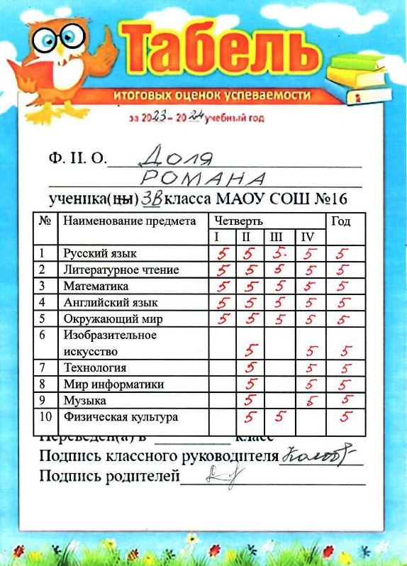 Каждый день Рома отправляется в школу - он ученик обычной общеобразовательной школы. Он учится «на отлично», абсолютно социализирован и коммуникабелен. Простите, не удержалась и хочу приложить его табель. Посмотрите, какой он молодец! И это ребенок, который когда-то ни на что не реагировал...