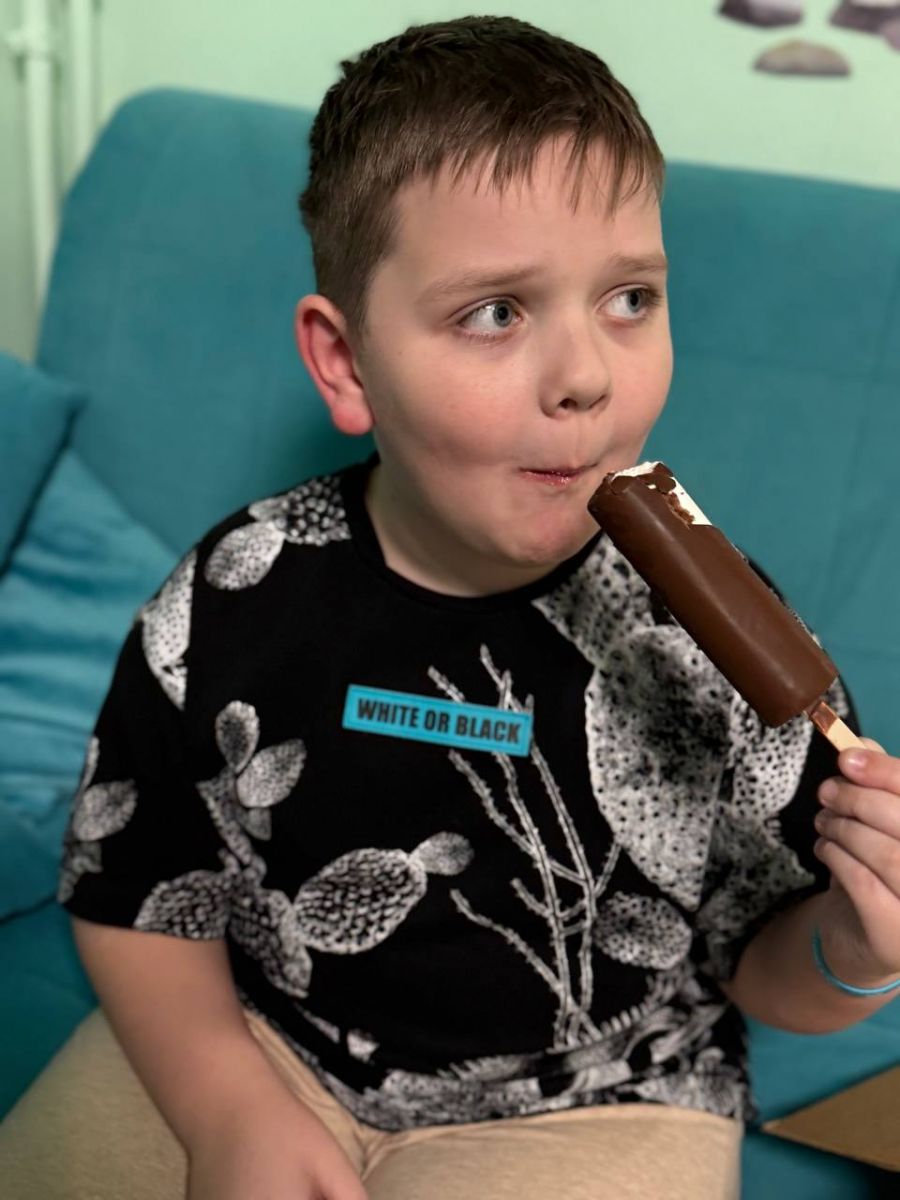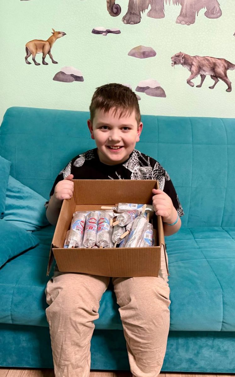 Рассказывает мама Дениса Харина: «Так уж случилось, что в силу болезни Денис очень избирателен в еде. Правда, в последнее время на лечебном питании мы наконец отъели щеки (не без вашей помощи, друзья! Теперь не знаем, что с этими щеками делать... Радуемся, ведь до этого Денису буквально просвечивался насквозь). А еще наше спасение – мороженое. Да еще и самое любимое лакомство! Но вот беда, ест Денис только одну марку и один вид. Так что на Новый год всегда мечтает о том, что добрый волшебник подарит ему заветное эскимо. И вот – мечта сбылась! Дедушка Мороз Антон прислал нам наше любимое и вкусное мороженое. Денис очень обрадовался подарку, тут же открыл и съел эскимо и просил передать огромное спасибо нашему дорогому дарителю за такой вкусный и самое главное долгожданный подарок.