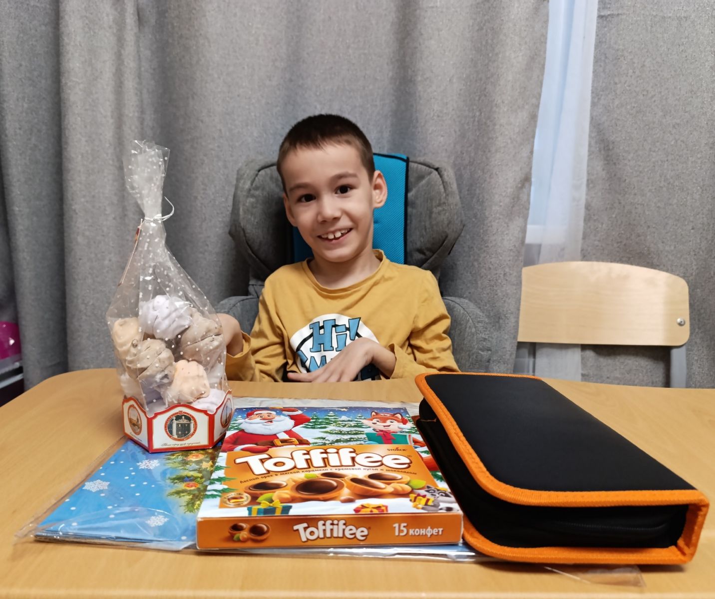 Рассказывает мама мальчика: «Здравствуйте, наши дорогие волшебники! Данияр получил свой желанный подарок под елочку. Набор для выжигания – и не только! Еще чудесные сладости! Какой же Новый год без них для нашего маленького сладкоежки!