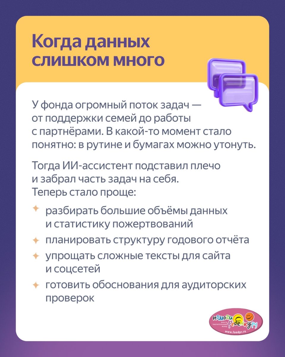 Искусственный интеллект вошел в жизнь нашего фонда не сразу, мы долго сомневались, наблюдали, изучали опыт, учились, но сейчас - используем его в различных сферах. Время неумолимо идет - и мы активно пытаемся идти в одну ногу со временем - систематизировать большие объемы данных, эффективно работать со статистикой и информацией, обрабатывать медицинские документы и исследования, в том числе на иностранных языках... Ведь фонд работает с тяжелыми и редкими заболеваниями. И некоторые из наших подопечных - это 3-4 уникальных человека на Земле... И понять, как им помочь, очень непросто. Ведь сначала надо понять - с чем мы имеем дело... А этого порой не знают не то что врачи, но и мировая наука в целом, называя ту или иную аномалию лишь перечнем цифр и букв... Ресурсы человека тут, порой, ограничены. Так что мы сталкиваемся и с открытиями, и с ошибками, и с проблемами, которые явно требуют скорейшего решения. Ведь сфера НКО очень мало охвачена работой ИИ. То, что сейчас существует – скорее, направлено на решение общих задач, без специфики нашей сферы.
