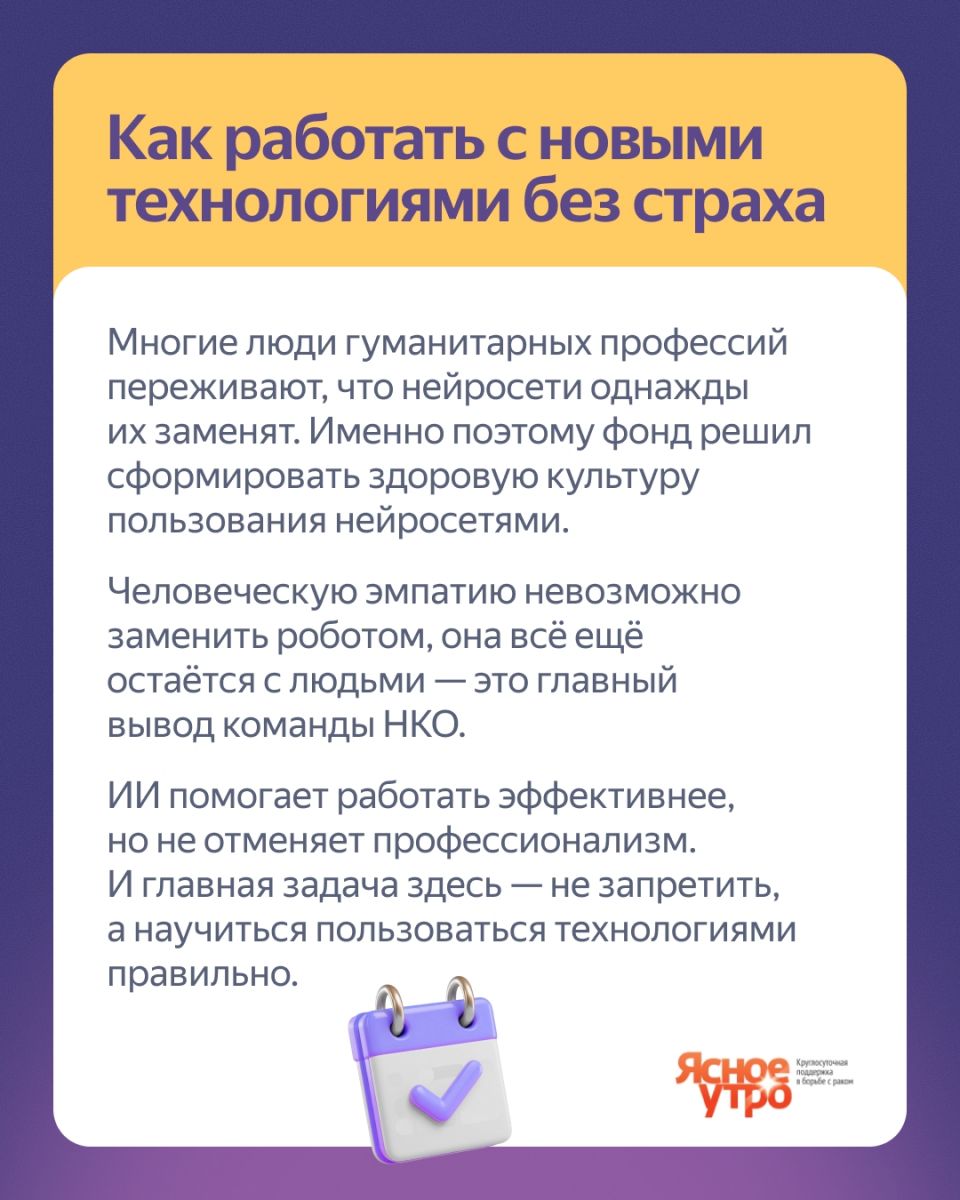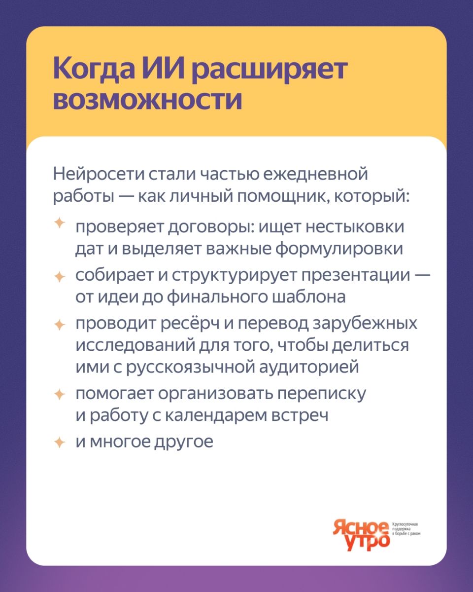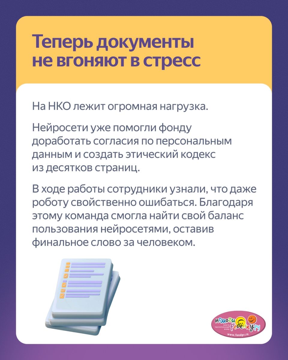И, конечно, мы очень рады, что у Яндекса появляется все больше важных и интересных разработок в сфере ИИ для НКО, которые позволяют экономить время при обработке информации и решении других повседневных задач и освобождают больше времени для работы с нашими подопечными и их родителями - работы, в которой Человек был и остается на первом месте!