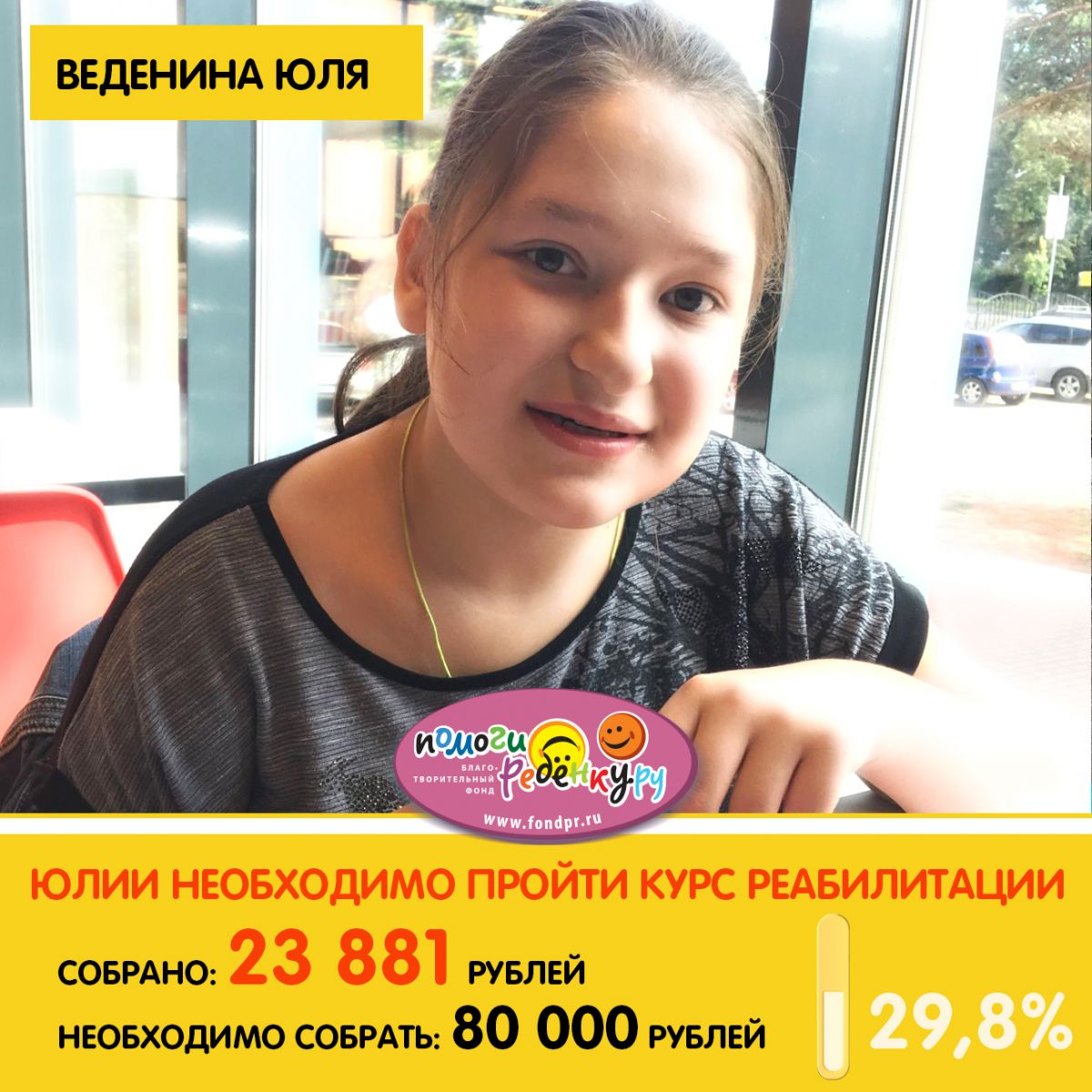 Сегодня на расчетный счет БФ "Помоги ребенку.ру" поступила очередная сумма, которая была собрана от жертвователей в поддержку нашего фонда в размере 11 180 рублей. Эти средства адресуются Юле Ведениной. Таким образом, на курс реабилитации Юли, который ей нужно пройти совсем скоро, остается собрать 62 620 рублей. И мы очень просим вас поддержать Юлю! Сделать это можно любым удобным способом, выбрав его в разделе "Как помочь" на главной странице нашего сайта.