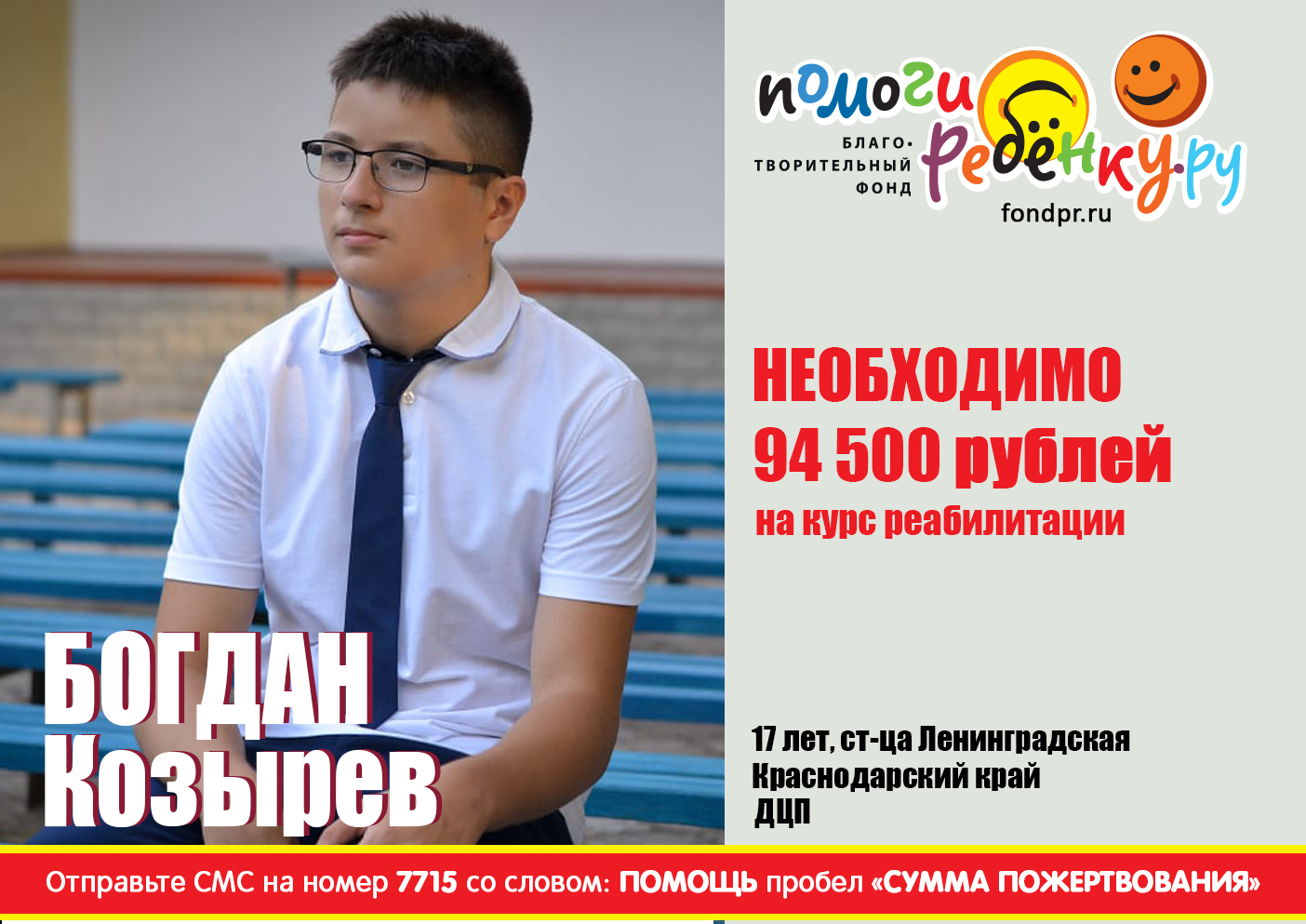 Рассказывает мама Богдана: За плечами моего сына две операции, десятки пройденных курсов реабилитации. Вопреки всем прогнозам, Богдан ходит, но с большим на данный момент трудом, на небольшие расстояния, мешает спастика мышц. Сейчас у него подростковый возраст. Сынишка сильно вырос, и его двигательные нарушения значительно ухудшились. Кости растут, а спастичные мышцы не успевают за костями, сильно деформировались стопы. Обучение в обычной школе стало непосильно, так в 9 классе дети активно готовились к экзаменам, учителя отпускали только к четырем часам дня. Усилился кифоз, стало трудно удерживать спину в прямом положении. Пришлось после нового года перейти на домашнее обучение. Плановая поездка на лечение Евпаторийский клинический санаторий весной сорвалась из-за пандемии коронавируса. Мы взяли счет на сентябрь, но нужной суммы накопить не смогли. А сынишке сейчас очень нужно лечение. И без вашей помощи нам на него не попасть! Пожалуйста, помогите нам в этом, пока Богдану не стало еще хуже, пока он не потерял всего, чего достиг!