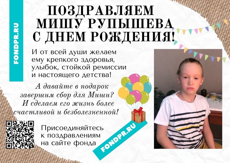 Присоединяйтесь к нашим поздравлениям, друзья! Вы можете присылать их в социальные сети или в гостевую книгу фонда. А еще было бы здорово завершить сбор для Миши. Чтобы на его лице снова была улыбка... Попробуем? Нас же много!