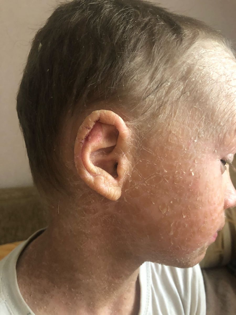 В 2012 году Миша появился на свет в очень тяжелом состоянии, и с этого момента для нашей семьи началась «особенная жизнь»… Первый год жизни малыша протекал в основном в больничной палате, назначали один препарат за другим, в том числе и очень сильные гормоны – преднизолон. Кожные покровы обрабатывали просто «методом тыка» - может что-то и поможет. Миша родился в так называемом «колойдном панцире»- все кожные покровы были покрыты толстым роговым слоем, который сразу после рождения начал трескаться, образовывались очень глубокие трещины, которые кровоточили и приносили новорожденному ребенку невыносимую боль. Плюс ко всему этому верхние веки вывернуты, «рыбий рот» - глаза и рот не закрывались, деформация ушных раковин – ушки были как ракушечки и т.д. . У Миши нет терморегуляции (он абсолютно не потеет), он легко перегревается, приходится дома постоянно поддерживать определенный режим температуры и влажности. Он не может жить, как обычные дети: бегать, прыгать и веселиться без последствий для своего здоровья. У него много раз были тепловые удары просто из-за того что чуть больше побегал или просто посидел в душном помещении. Эта болезнь у моего сына протекает крайне тяжело со множеством угрозами здоровью.
