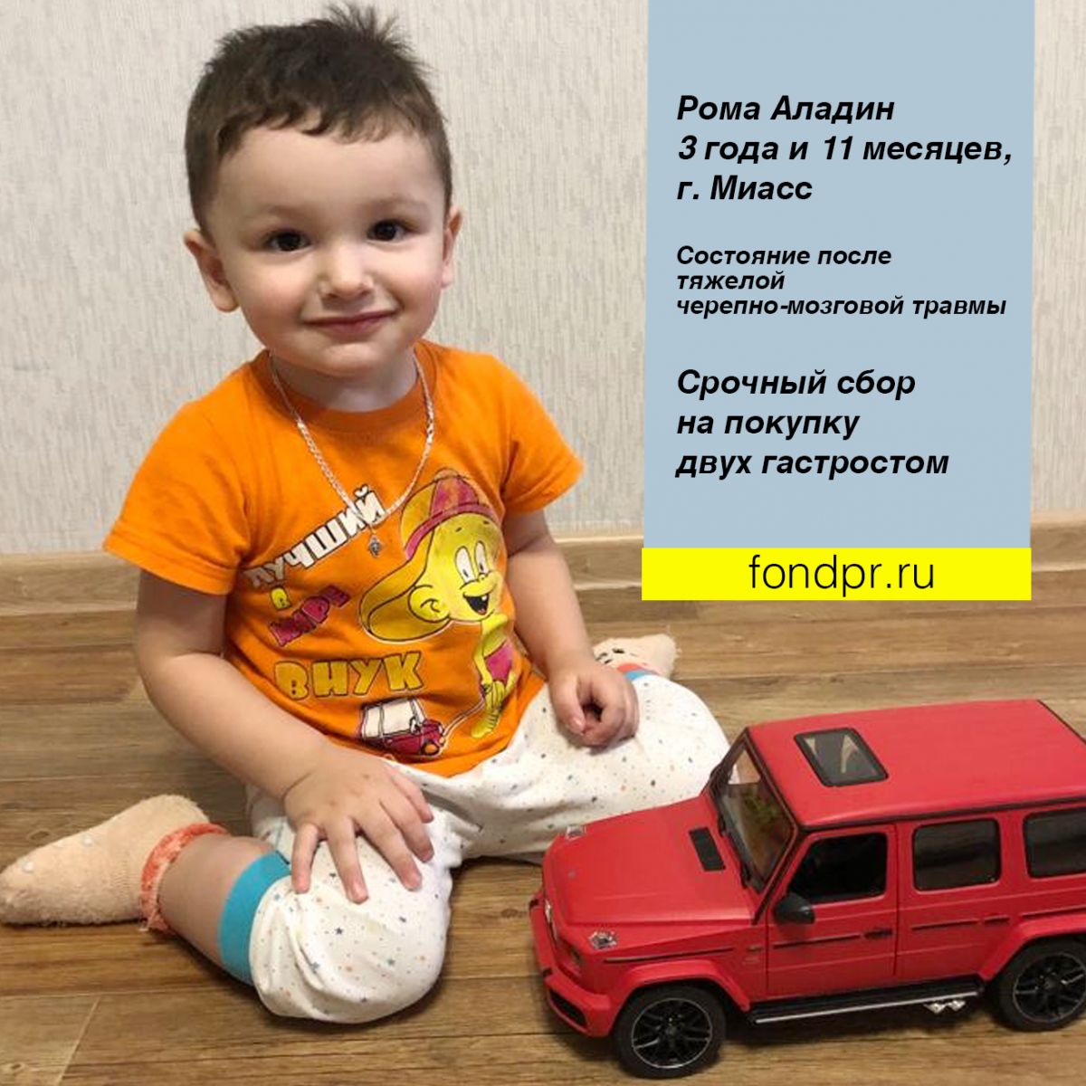 Когда Роме было два с небольшим годика, он получил тяжелейшую черепно-мозговую травму. Опираясь на москитную сетку, он упал из окна. На бетонный пол. Это был самый страшный день в жизни родителей. В больнице, куда малыша привезли в тяжелом состоянии, ему сделали 3 операции. Чтобы спасти жизнь. Два долгих месяца кроха провел в отделении нейрохирургии. Ему поставили трахеостому и гастростому. А потом выписали с диагнозом «бодрствующая кома». Домой, в Миасс. Без особых надежд на восстановление... Где врачи не представляли, что делать с ребенком. Родителям оставалось только надеяться на чудо. И искать способы его совершить. И чудо случилось. Наверное, с мальчиком с такой волшебной фамилией – «Аладин» не могло быть по-другому. Почти сказочный «АладДин». После реабилитации и постоянных занятий с родителями дома Рома начал реагировать на голосовые просьбы, двигать руками и ногам, удерживать голову. И это начало очень непростого пути. Сейчас Роме очень срочно нужно поменять гастростому. Буквально сегодня-завтра. Чтобы Рома продолжал идти вперед. Чтобы помочь чуду случиться. Чтобы Рома наконец смог однажды вернуться к обычной жизни.