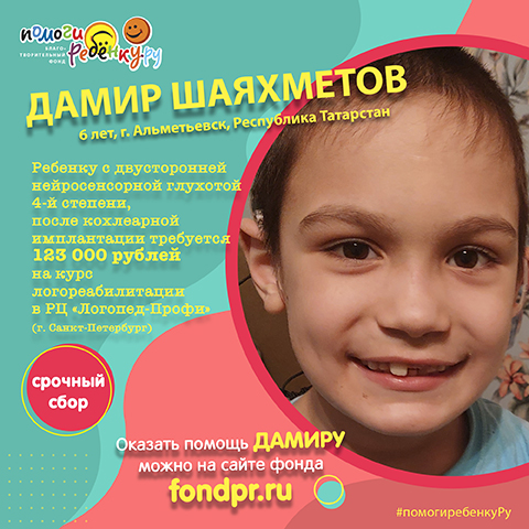 В семье Шаяхметовых двое детей-инвалидов. Маленький Дамир родился почти полностью глухим. Правое и левое ушко не работали. А в роддоме этого никто не заметил (прибор для аудиотеста не работал). Родители узнали эту тяжелую новость, только когда малышу исполнился месяц. Слезы отчаяния, боль… Двое детей – и оба тяжело больны. У одного ДЦП, у второго вдобавок к тяжелой степени тугоухости - СДВГ, задержка психоречевого развития. Но опускать руки было нельзя. Оформив инвалидность, мама и папа Дамира не смирились, а стали искать возможности, как помочь малышу. И нашли! Дамиру провели две операции по кохлеарной имплантации, и в 10 месяцев кроха услышал первые звуки, голос мамы и папы! Это было огромное счастье. Но к сожалению, Дамиру нужна постоянная логопедическая реабилитация. А в г.Альметьевске, где живет мальчик, нет даже сурдопедагогов. Сейчас Дамиру 6 лет, но пока его понимают только родители. И то с трудом… Хотя малыш очень старается. У него уже появилась фразовая речь. А вот обращенную речь он почти не понимает. И мы просим вас помочь маленькому Дамиру научиться общаться с окружающим миром! Сейчас важно не упустить время. Его семье оплатить такой курс не по силам. Его стоимость 165 500 рублей.