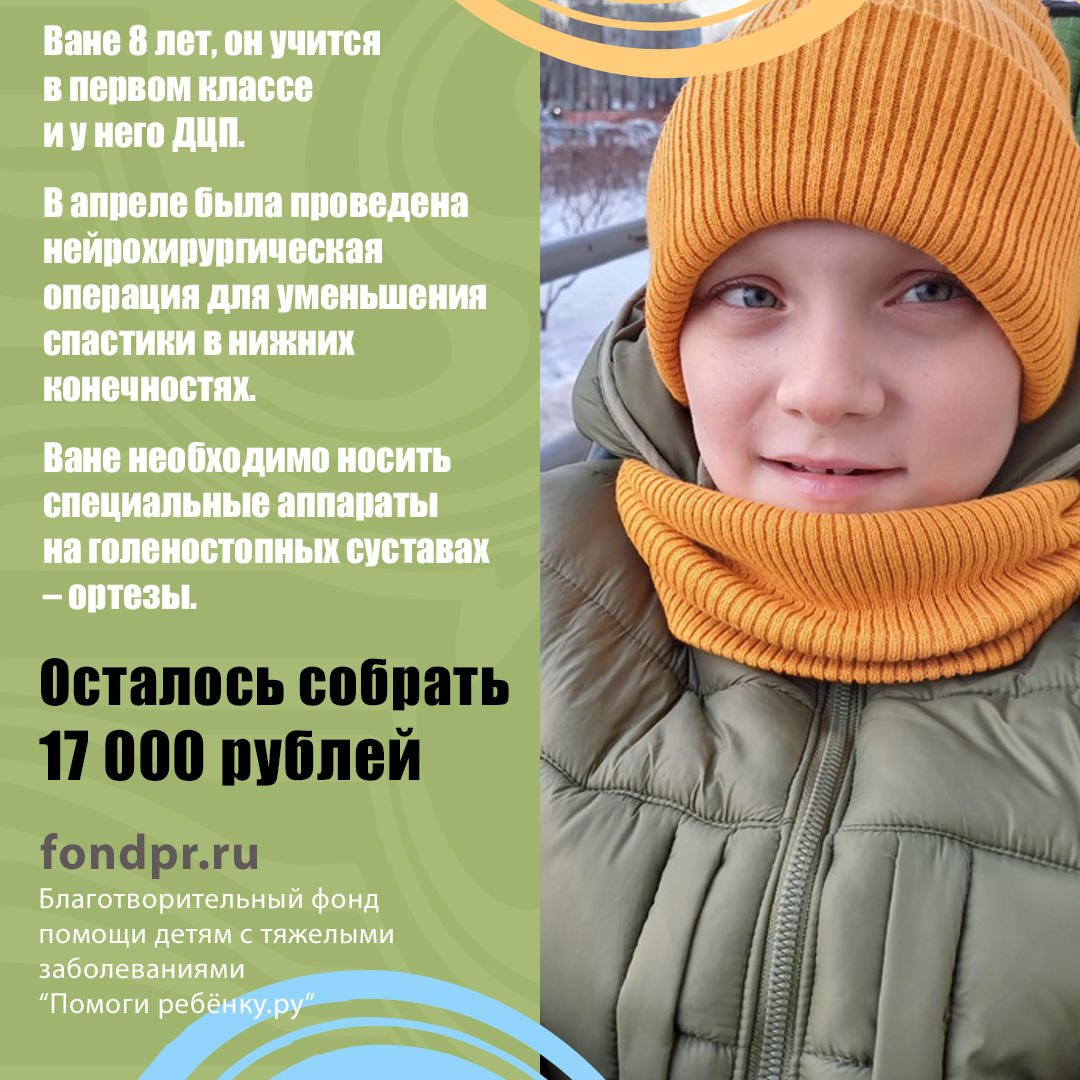 На данный момент Ване 8 лет. И у нас есть успехи. Ваня держит голову, самостоятельно сидит, правда, пока только в специальном кресле, ходит с поддержкой. В плане речи - разговаривает отдельными звуками, но слова пока не произносит. Мы пошли в школу, в 1 класс, специализированный. Занимаемся дома, делаем массаж и проходим курсы реабилитации, когда есть такая возможность и поддержка от благотворительных фондов. После каждого курса у Ванечки – положительная динамика. Но на все необходимы большие средства – ТСР, специалисты, лекарственные препараты, регулярные занятия…, а нашей семье это не по силам. 1 апреля Ванечке предстоит операция СДР, после которой будет необходима длительная реабилитация и ношение специальных ортезов, которые помогут закрепить положение ног в правильном состоянии. В случае Вани ношение ортезов особенно важно, т.к. у него множественные контрактуры, подвывих правого и вывих левого бедра, и после операции без специальной фиксации высок риск отката не просто к предшествующему состоянию, а даже его ухудшение. И мы очень просим вашей помощи в оплате ортезов для Вани! Самим нам не справиться.