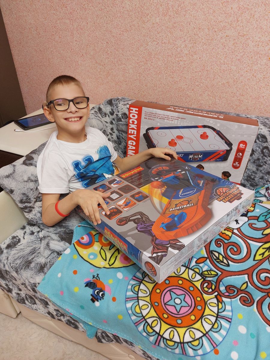 Рассказывает мама Рамиля: «Несмотря на ДЦП в тяжелой форме, наш Рамиль за 9 лет добился больших успехов: он любит учиться, рисовать, научился ходить с поддержкой, разговаривать. А вот ходить самостоятельно, а тем более бегать – пока не получается, как и встать на коньки, хоть и наша погода на краю света, в далеком поселке, где расположен полюс холода, к этому очень располагает… Рамиль с увлечением смотрит, как другие дети играют в баскетбол, хоккей, как играют профессиональные игроки – ему это недоступно. Но однажды и у него все обязательно получится, мы верим! Недавно Рамиль увлёкся настольными играми. И весь год мечтал о том, чтобы у него появилась настольная игра «Аэрохоккей» или «Баскетбол». И благодаря вам, дорогие волшебники, его мечта сбылась!