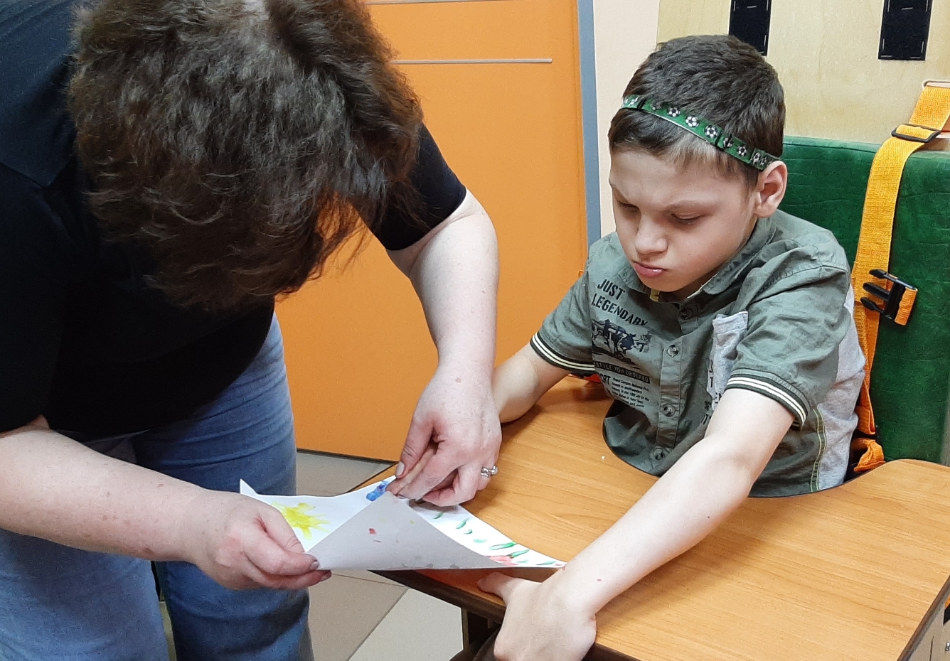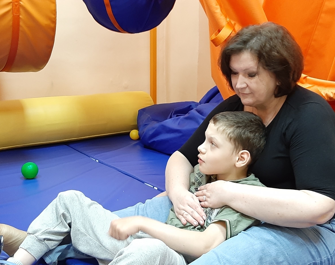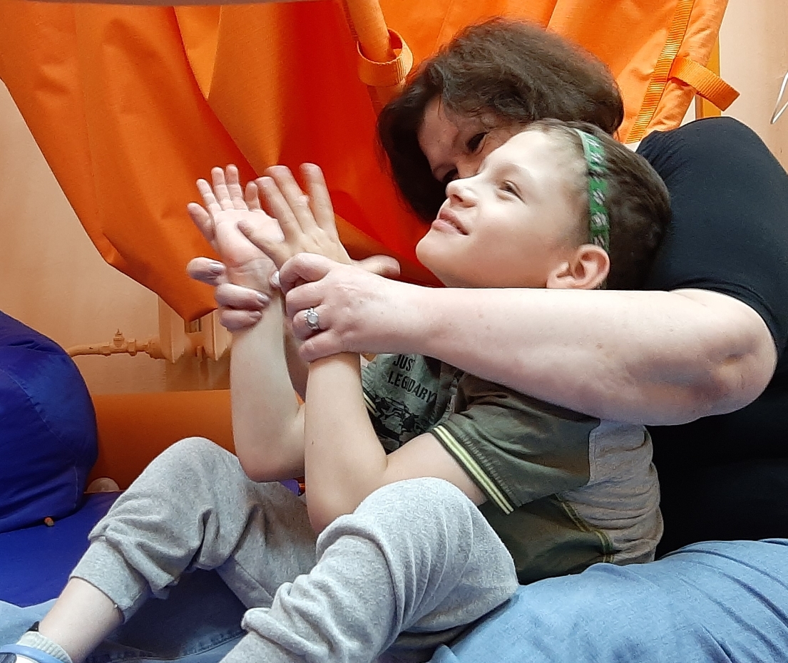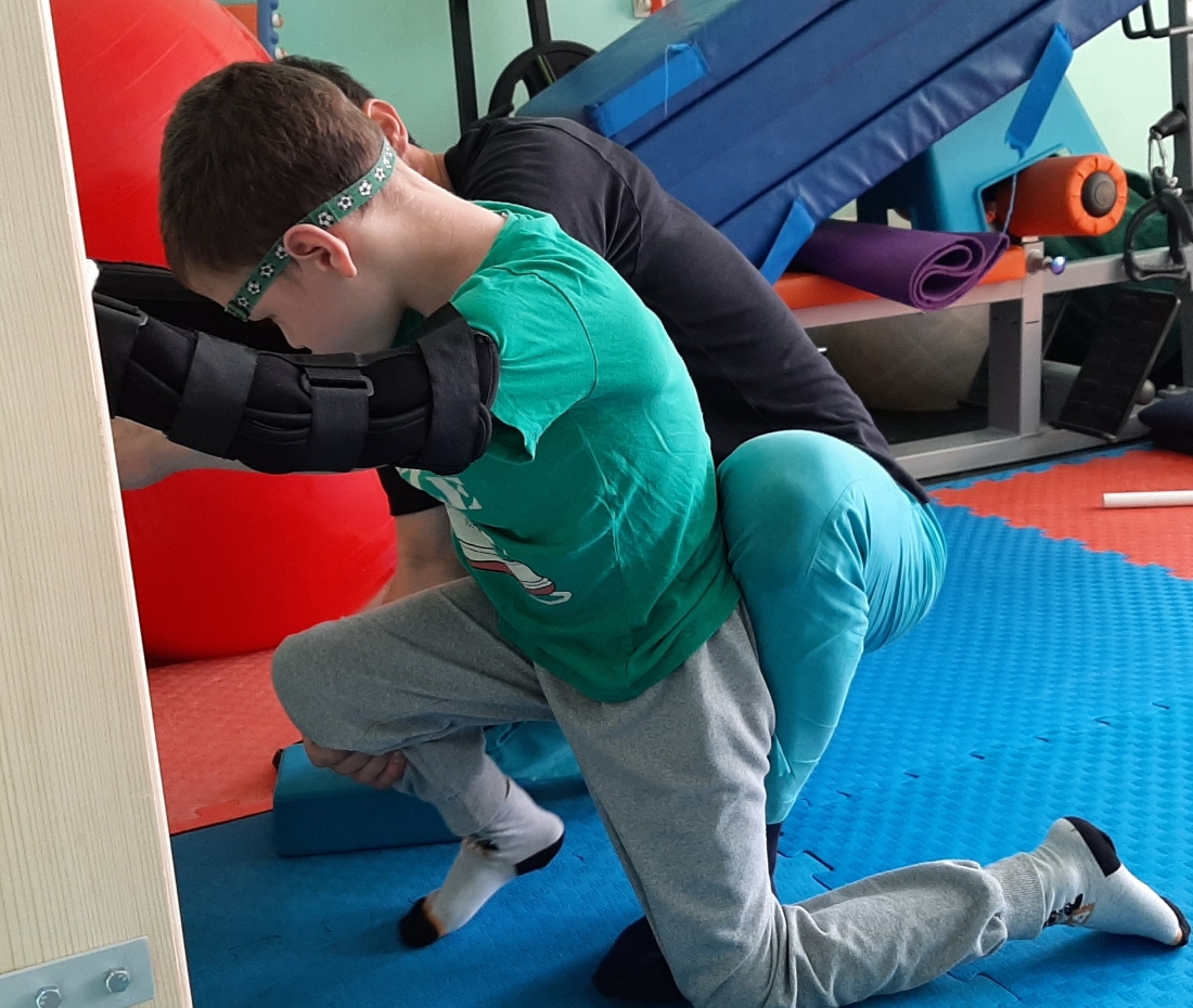 Динар постоянно проходит курсы реабилитации – и двигательные и слуховые, а также занятия с сурдопедагогом, дефектологом. К настоящему моменту он научился ползать на четвереньках, сам встает на четвереньки, сидит с небольшой опорой. Сейчас занимаемся упражнениями для укрепления спины, чтобы сын мог лучше себя удерживать, потому что спина у него очень слабая, делаем растяжки. Выполняем упражнения на высоких коленях и в вертикальном положении, стоя на ножках в туторах. Работаем над понимаем речи, над накоплением словаря, развитием слухового внимания, развитием коммуникации с помощью жестов и карточек.