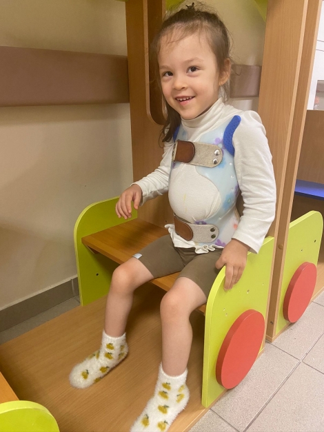 На данный момент дочке в развитии очень мешает сколиоз, который не характерен детям в нашем возрасте, ортопеды не могут пояснить, почему он у нас появился так рано, и ситуация продолжает ухудшаться. За год с 5% отклонение увеличилось до 21%, теперь корсет наш постоянный спутник, дочка в нем 24 часа в сутки, все 7 дней в неделю.