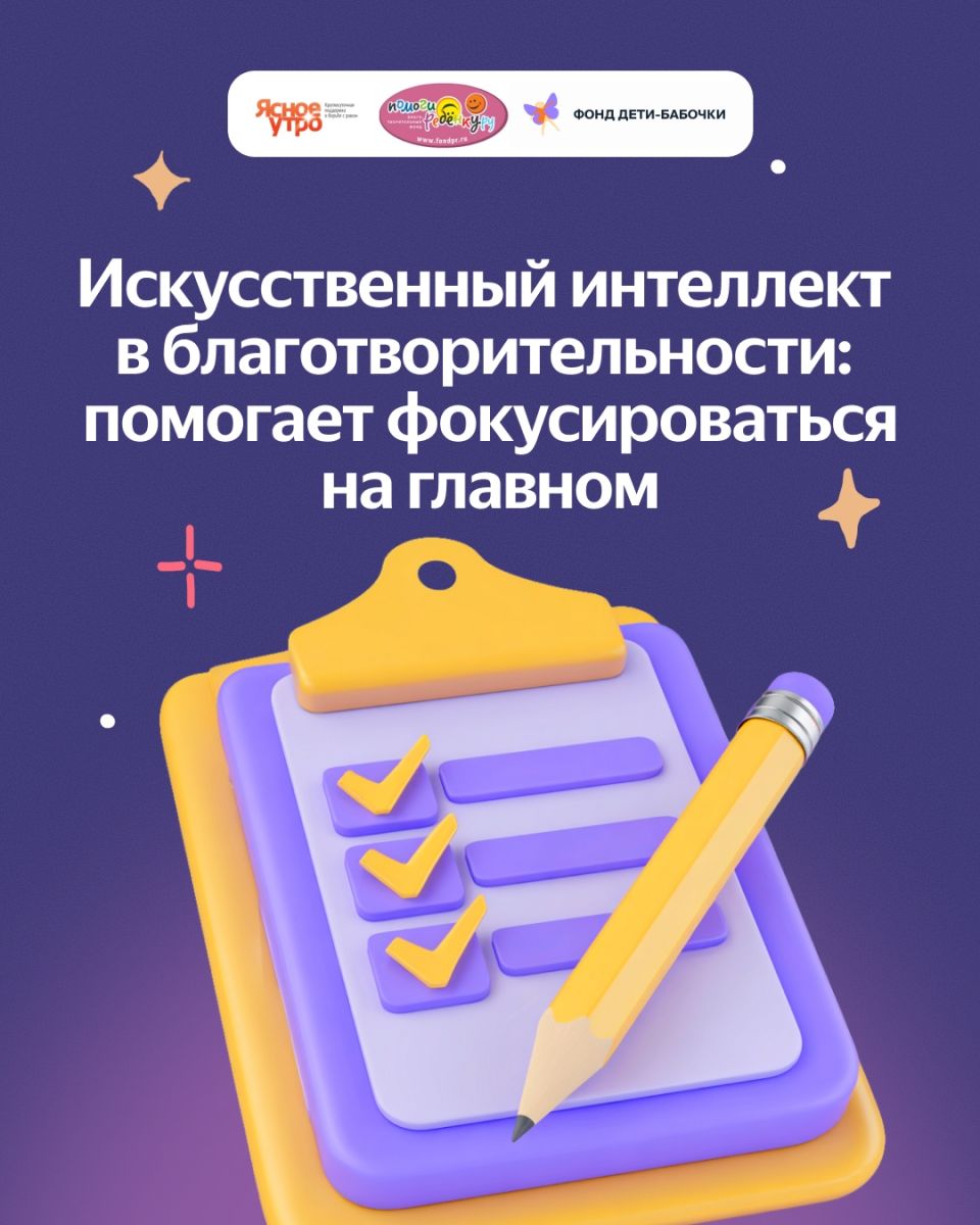 И мы очень рады, что наши коллеги из благотворительного фонда Яндекса «Помощь рядом» не оставили наши мысли без внимания. И пригласили поучаствовать в важном исследовании, которое помогло не только поделиться опытом, но и выявить проблемные точки, где ИИ остро не хватает. В этом исследовании мы приняли участие вместе с коллегами из фондов "Ясное утро" и "Дети-бабочки".