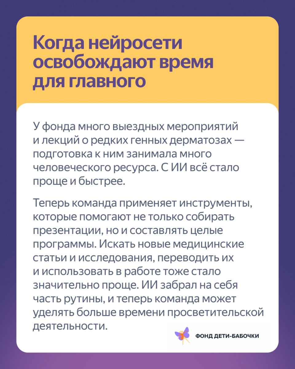 И, конечно, мы очень рады, что у Яндекса появляется все больше важных и интересных разработок в сфере ИИ для НКО, которые позволяют экономить время при обработке информации и решении других повседневных задач и освобождают больше времени для работы с нашими подопечными и их родителями - работы, в которой Человек был и остается на первом месте!